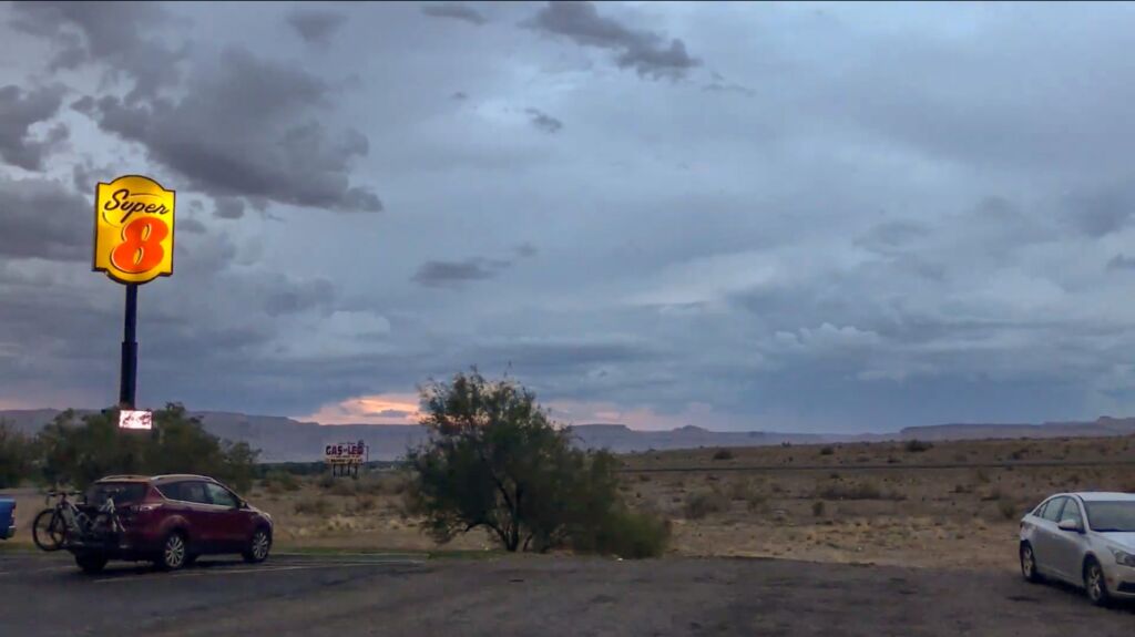 You watch the thunderheads swell in the north, across the Book Cliffs. Storms blow in for a long time, the country is open. The air is warm, the night is young, turning a dyspeptic shade of purple. Sunset struggles through the clouds, but you’re more illuminated by the sickly lampposts and the yellow and red “Super 8” sign buzzing, burning out above the parked cars. Lightning plays across the way. The wind is gentle where you’re standing. Thunder rolls, you realize. It doesn’t clap. It rolls like a suitcase across some cheap vinyl flooring. That’s how it sounds. A rumble and a roll, like the California Zephyr pulling out of the Amtrak station en route to San Francisco. Zephyr—they named those trains after the winds of yore. They just blow on through town, winds and trains alike.